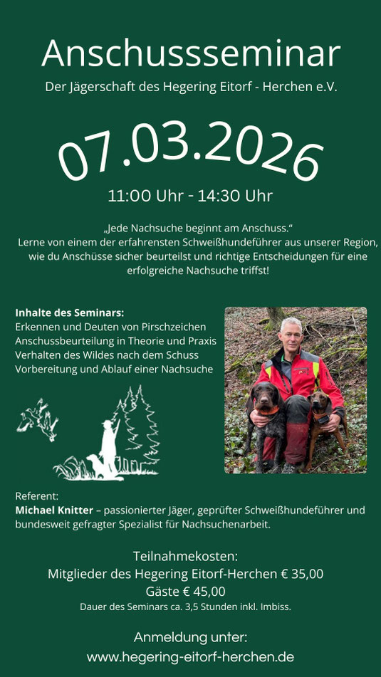 Die Jägerschaft des Hegerings Eitorf–Herchen e.V. lädt herzlich ein zum Anschussseminar am Samstag, den 07.03.2026 von